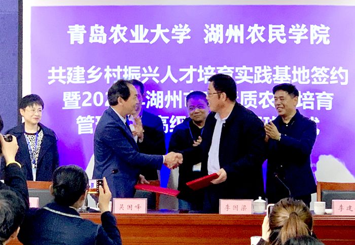 仪式上,青岛农业大学继续教育学院院长李国梁与我校继续教育学院院长、湖州农民学院办公室主任吴国峰分别代表双方签署了《青岛农业大学湖州农民学院战略合作协议》。根据协议,双方将深入研究和充分利用各自优势,更好地在学科发展、人才培养、成果转化等方面提供基地和样本支撑,双方通过共建互设“乡村振兴人才培育实践基地”,充分发挥各自农民教育资源优势,紧紧围绕两地农业主导产业,互派专家担任特聘教授,共同举办专题研讨会,合作开展研究,联合举办农民教育教师进修班和高素质农民培训班等,共建共享各自教学实践基地、科学研究基地、社会活动基地,以基地共建共享形式推动乡村人才振兴和农业科学技术成果转化和应用。