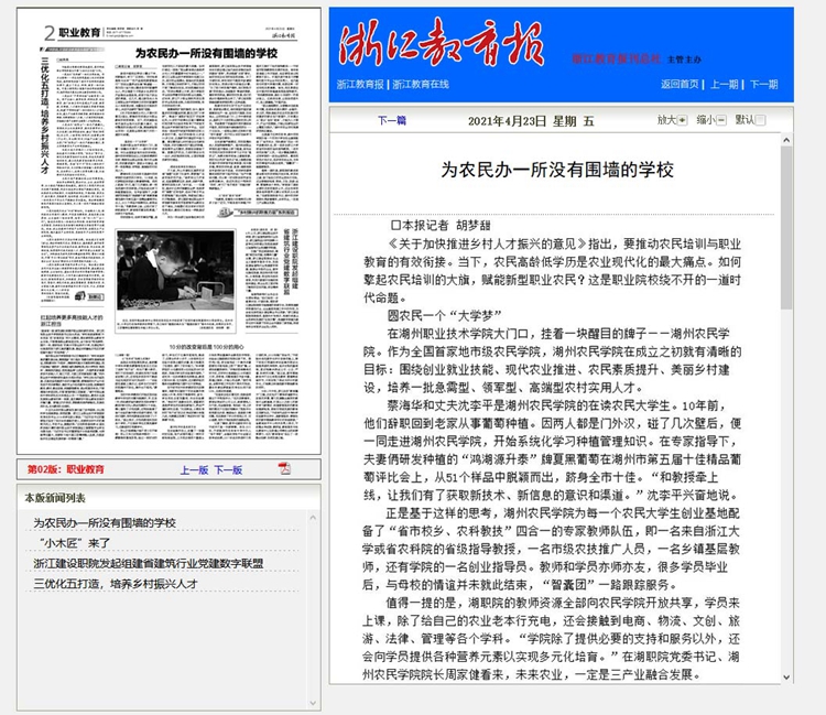 2021年4月23日《浙江教育报》对我校开展农民教育进行了相关报道
