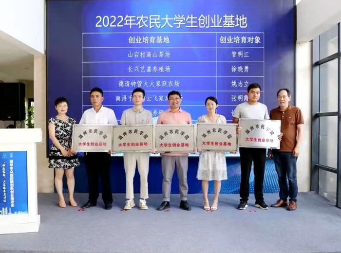 为进一步整合资源、集聚力量,让更多的农业企业、农户和创业者都能够搭乘“科技富农”班车,7月20日下午,湖州市科技局、湖州农民学院共同举办的湖州市众创田园创新创业推进会暨湖州农民学院2022年农民大学生创业基地授牌仪式在吴兴区湖州弘鑫生态农业科技有限公司顺利举行。市科技局党组成员、二级调研员张利剑,市农业农村局党委委员、南太湖农推中心主任徐海圣,市农业农村局法规与科教处处长李建华,学校继续教育学院院长、农民学院办公室主任吴国峰等参加会议。
