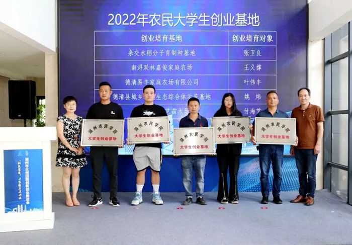 会议现场举行了科技特派员与市级众创田园结对仪式及2022年湖州农民学院农民大学生创业基地授牌仪式。